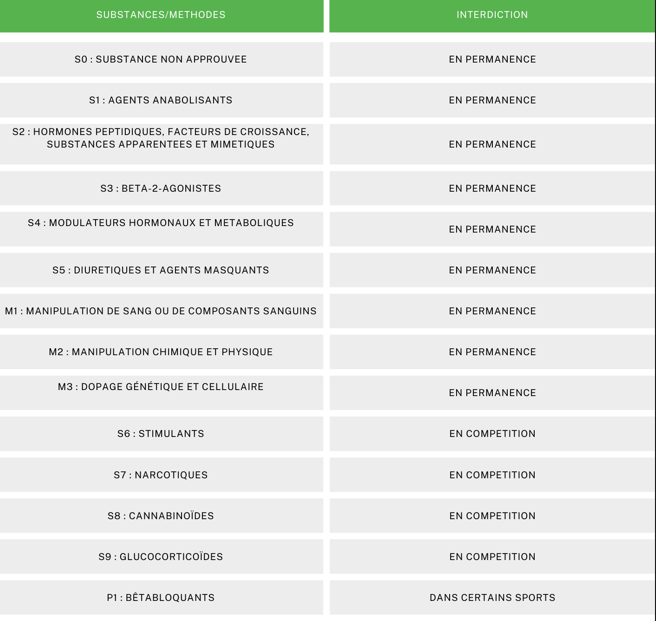 - Substances interdites en permanence : Cela signifie que la substance ou la méthode est interdite en tout temps